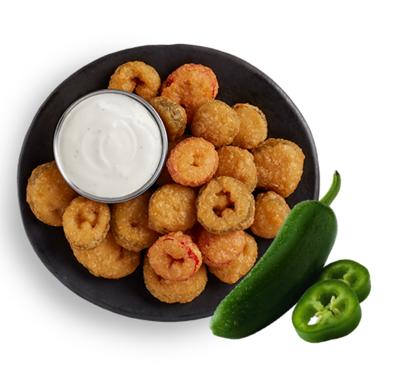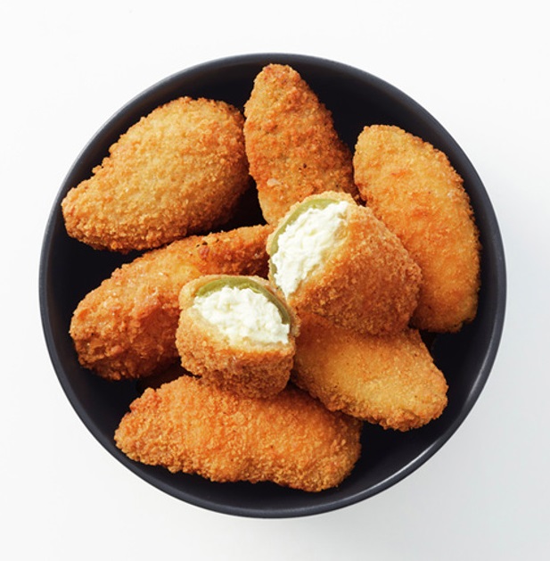 Una combinación de chiles jalapeños picantes con una capa crujiente en forma redonda del tamaño de un bocado.